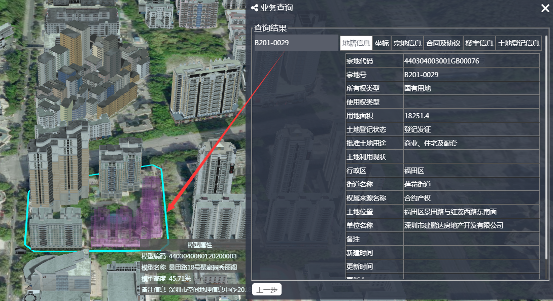 将建筑物编码、名称和高度等属性信息嵌入模型内部,每个三维建筑模型都有唯一的建筑物编码,通过建筑物编码与业务属性表的关联可实现三维模型更深层次的应用。