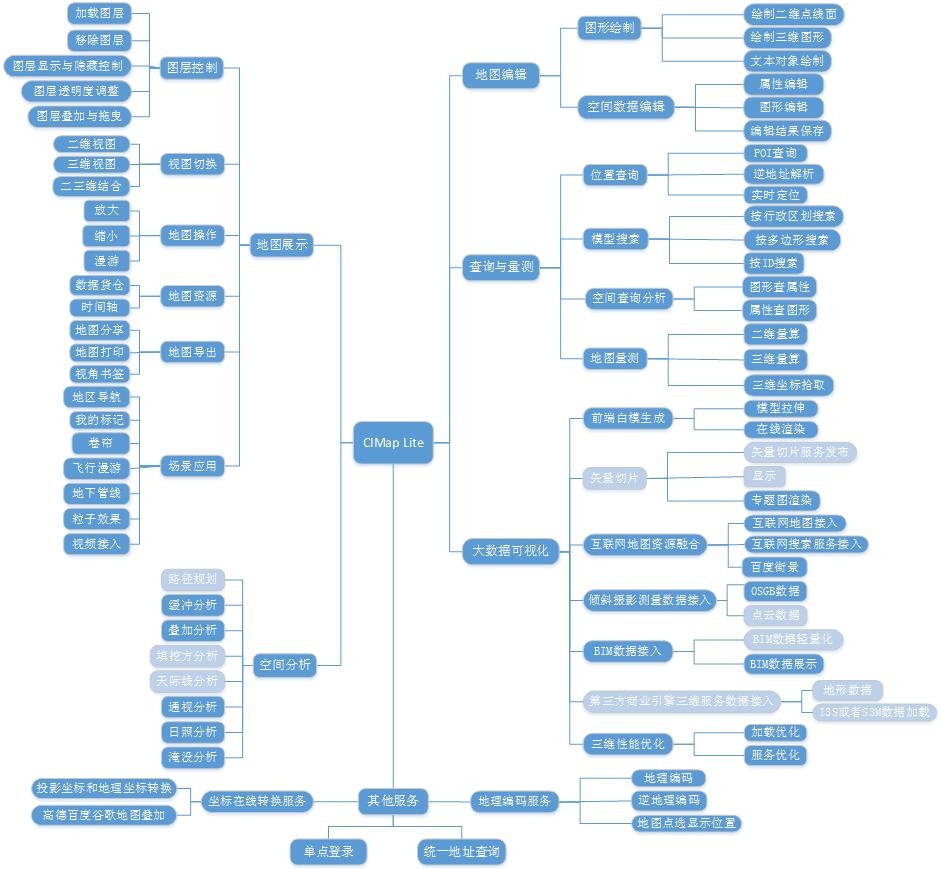 如下图所示,CIMap Lite共分成六大功能模块,分别是地图展示、地图编辑、查询与量测、空间分析、大数据可视化和其他服务(包括坐标转换、地理编码、统一地址查询和单点登录服务等)。