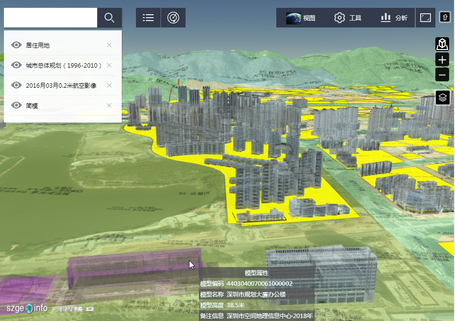 可批量实现深圳市60余万栋建筑物模型的快速生产,并可同时根据需要为模型嵌入属性信息。